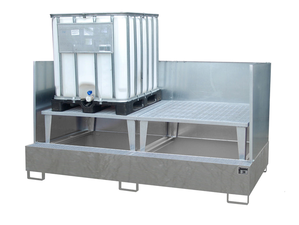Lagerung von IBC à 1000 Liter, auch mit Fässern (60/200 Liter) und Kleingebinden kombinierbar, mit Abfüllaufsatz und Spritzschutzwand